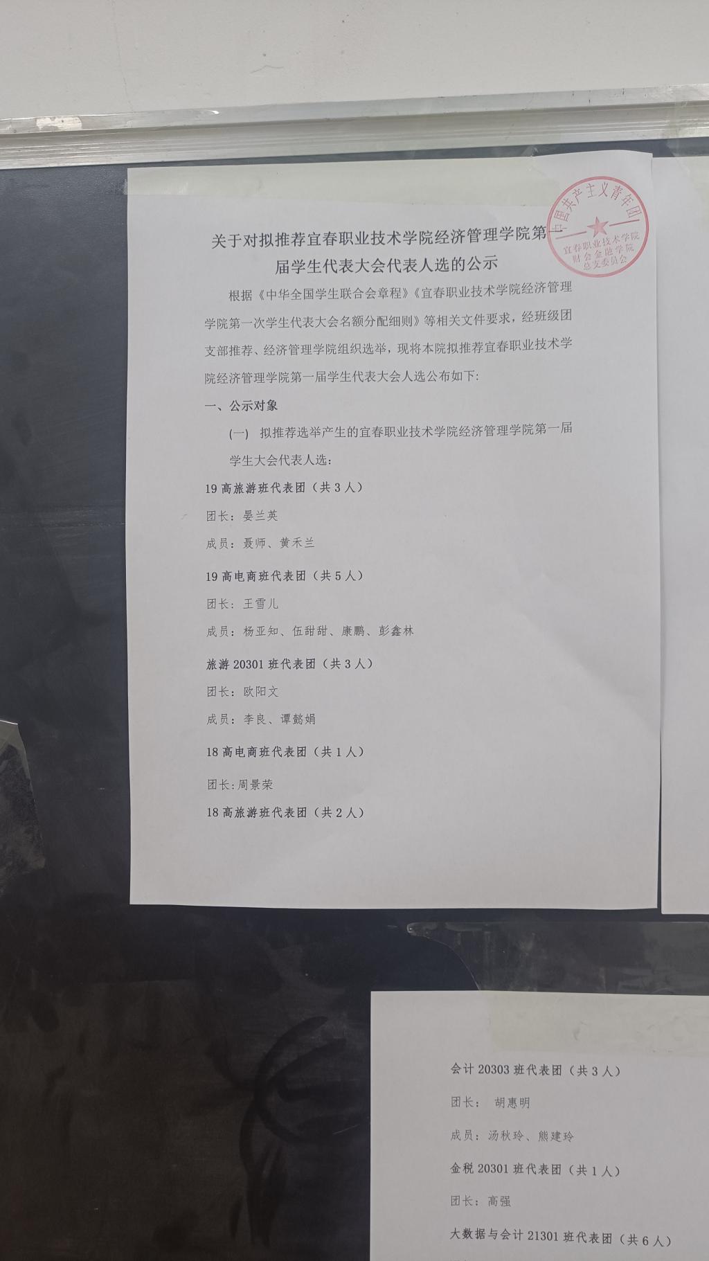 根据《中华全国学生联合会章程》《宜春职业技术学院经济管理学院第一次学生代表大会名额分配细则》等相关文件要求,经班级团支部推荐、经济管理学院组织选举,现将本院拟推荐宜春职业技术学院经济管理学院第一届学生代表大会人选公布如下: 一、公示对象 (一) 拟推荐选举产生的宜春职业技术学院经济管理学院第一届学生大会代表人选: 19高旅游班代表团(共3人) 团长:晏兰英 成员:聂师、黄禾兰 19高电商班代表团(共5人) 团长: 王雪儿 成员:杨亚知、伍甜甜、康鹏、彭鑫林 旅游20301班代表团(共3人) 团长:欧阳文 成员:李良、谭懿娟 18高电商班代表团(共1人) 团长:周景荣 18高旅游班代表团(共2人) 团长:丁桃妹 成员:况莉婷 电商20301班代表团(共4人) 团长:周刚强 成员:桂欢、车玲玲、陈欣染 电商20302班代表团(共3人) 团长:罗文斌 成员:彭露、刘仔威 电商21301班代表团(共4人) 团长: 陈思磊 成员:丰文丽、樊佳欣、周名明 电商21302班代表团(共4人) 团长:何海鑫 成员:胡玉娇、胡清奇、黄素玉 电商21303班代表团(共4人) 团长:李强 成员:罗芳、李欣、刘佳 电商21304班代表团(共4人) 团长:魏松 成员:彭星宇、聂倩影 、聂程雯 电商21305班代表团(共8人) 团长:王圆 成员:易梦灵、袁胜、熊宇杰、谢雨欣、吴梦玲、温嘉怡、吴丹梦 电商21306班代表团(共4人) 团长:邹健 成员:嫣雨佳、易元君、钟芊 旅游21301班代表团(共6人) 团长: 周科良 成员:张美娟、刘鑫、张小婷、许艳、杨志 19高会计1班代表团(共3人) 团长: 王楗浩 成员:陈秋香、高阳 19高会计2班代表团(共3人) 团长: 邱钟明亮 成员:黎可欣、曾美艳 会计20301班代表团(共4人) 团长: 王骏杰 成员:邓慧玲、连芳旭、彭语铮 会计20302班代表团(共3人) 团长: 吴宇杰 成员:易思梦、张佳华 会计20303班代表团(共3人) 团长: 胡惠明 成员:汤秋玲、熊建玲 金税20301班代表团(共1人) 团长:高强 大数据与会计21301班代表团(共6人) 团长: 周予然 成员:曾持瑄、刘兰毅、简思琴、付旖恬、胡佳 大数据与会计21302班代表团(共6人) 团长: 张宏宇 成员:黄雨欣、李勤婕、刘雨晨、胡盈霞、习小倩 大数据与会计21303班代表团(共2人) 团长: 席帅琪 成员:甘江鑫 大数据与财管21301班代表团(共2人) 团长: 王枫 成员:刘丽 金融科技应用21301班代表团(共4人) 团长: 易文春 成员:李欢、聂茜子、刘宇静 社团代代表团(共4人) 团长: 陈勇 成员:易苏、王思君、肖巧 二、公示期限 2022年9月28日至2022年9月30日 三、公示要求 公示期自即日始3个工作日,凡对上还同学推荐有意见者,请及时以书面或来访形式向本院团总支反馈意见。 联系人:赖朝阳 联系电话: 13317955961 特此公示 中国共产主义青年团 宜春职业技术学院 经济管理学院总支委员会 2022年9月27日 上一条:经济管理学院召开新学期学生座谈会 下一条:经济管理学院开展党的基本知识教育活动