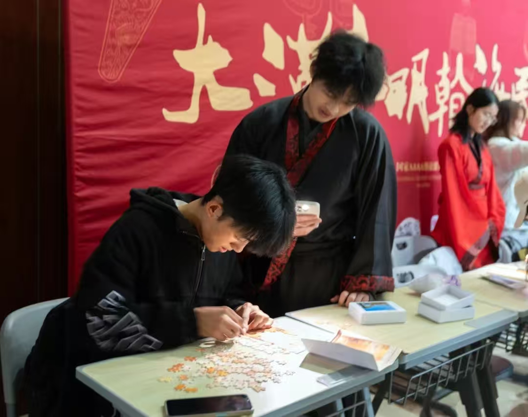 场外设置的文化产品展示与互动体验区吸引了众多师生参与。竹简描金,让千年前的书香跃然指尖;文物拼图,在方寸之间重现青铜重器;拓片拓印,借墨色浸染将古老的纹饰印记恒久留存……通过亲手触摸和制作,沉睡千年的海昏文化以全新的方式焕发生机,在青年学子心中播下文化传承的种子。