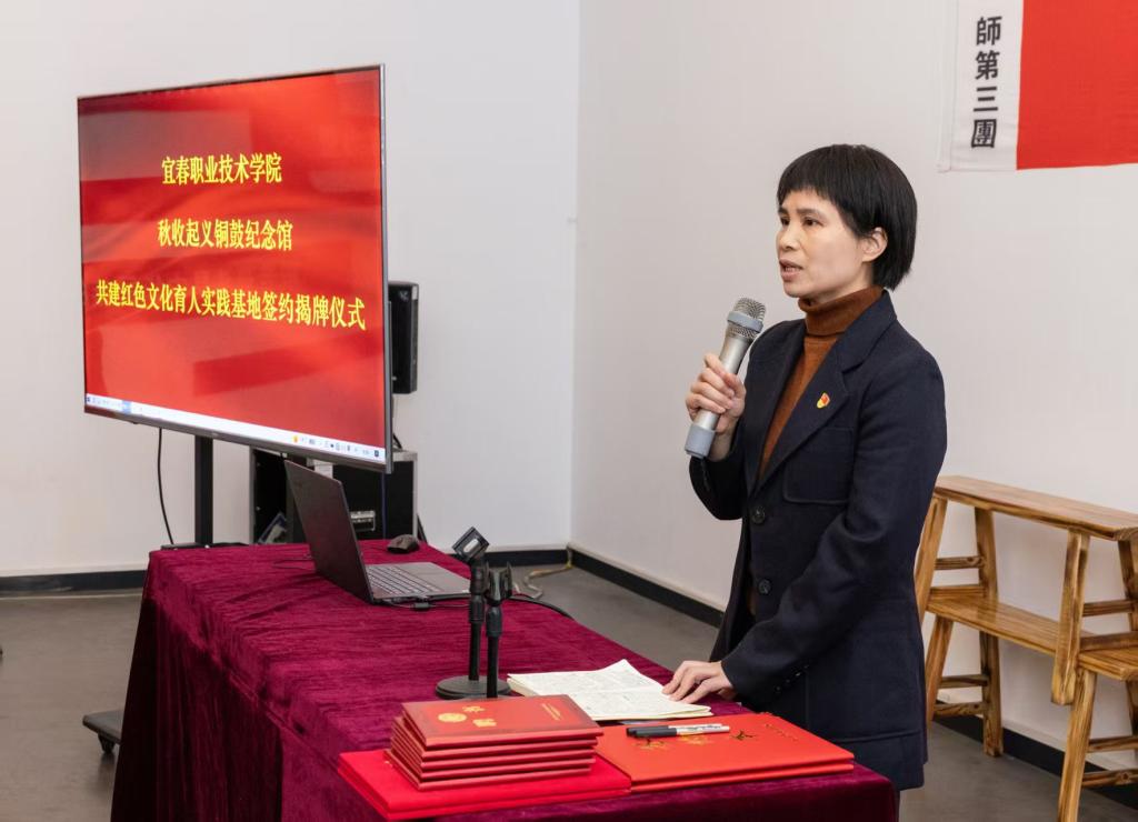 本站讯(党委宣传部 潘睿琦)12月5日,宜春职业技术学院与秋收起义铜鼓纪念馆共建“红色文化育人实践基地”签约仪式暨首场大思政课活动在秋收起义铜鼓县纪念馆内举行。铜鼓县全域旅游发展中心七级职员邓永忠,秋收起义铜鼓纪念馆副馆长刘旋、赖济红,我校党委委员、宣传部部长马天娥及有关部门负责人出席活动,纪念馆全体工作人员及我校师生代表70余人参加活动。