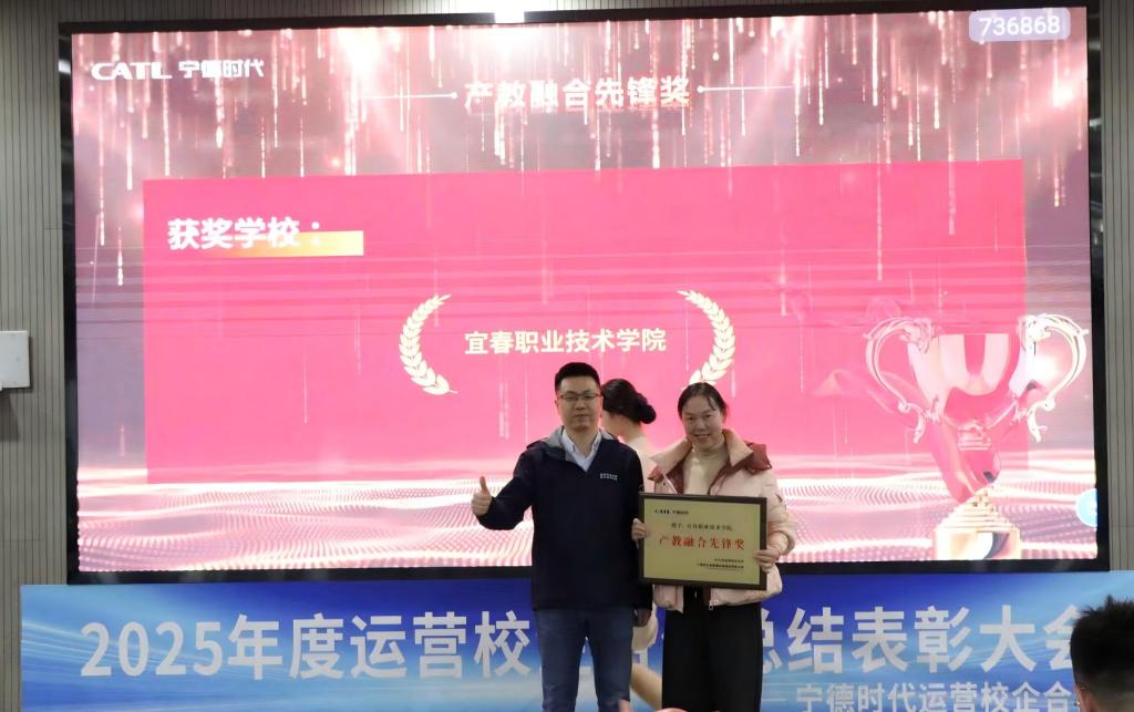 在表彰大会上,任军作题为《链动锂电新生态产教融合育新才》的主题报告。任军指出,自2023年携手以来,学校与宁德时代围绕宜春建设“亚洲锂都”的战略需求,共同构建了从“订单班”到“现场工程师学院”、从“校企双边”到“行业产教融合共同体”的深度合作体系。凭借在校企协同育人方面的扎实工作与显著成效,我校被宁德时代授予“产教融合先锋奖”,刘叶建代表学校上台领奖。这一荣誉,是对我校长期以来坚持面向产业、携手名企、深化合作办学模式的充分肯定,标志我校产教融合工作迈上了新的台阶,获得了业界龙头的高度认可。