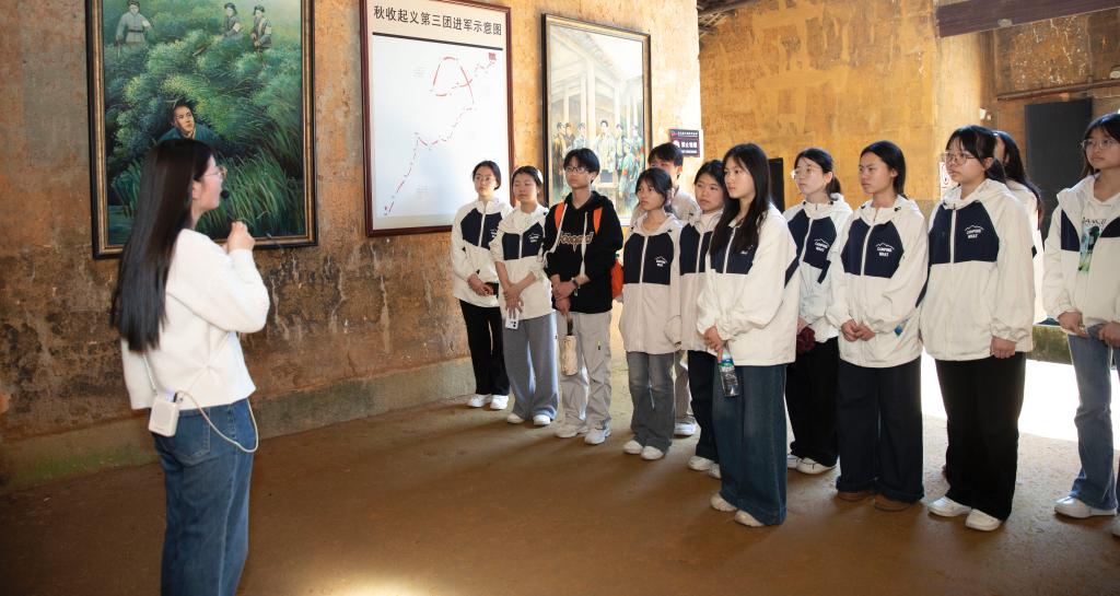 春日晨光里,师生们乘车抵达秋收起义铜鼓纪念馆。在讲解员的引领下,师生依次走进展厅,一幅幅承载岁月的历史照片、一件件历经风雨的革命文物、一座座还原峥嵘岁月的场景雕塑,搭配多媒体影像,将大家瞬间拉回那段风雷激荡的革命年代。“军叫工农革命,旗号镰刀斧头”的壮阔史诗,在实物与史料的交织中愈发鲜活可感。随后,师生前往湘赣边秋收起义前敌委员会旧址萧家祠,近距离参观陈列的会议桌和抗战兵士的卧室,在沉浸式观览中深刻体悟“红色政权来之不易、新中国来之不易”的厚重内涵。
