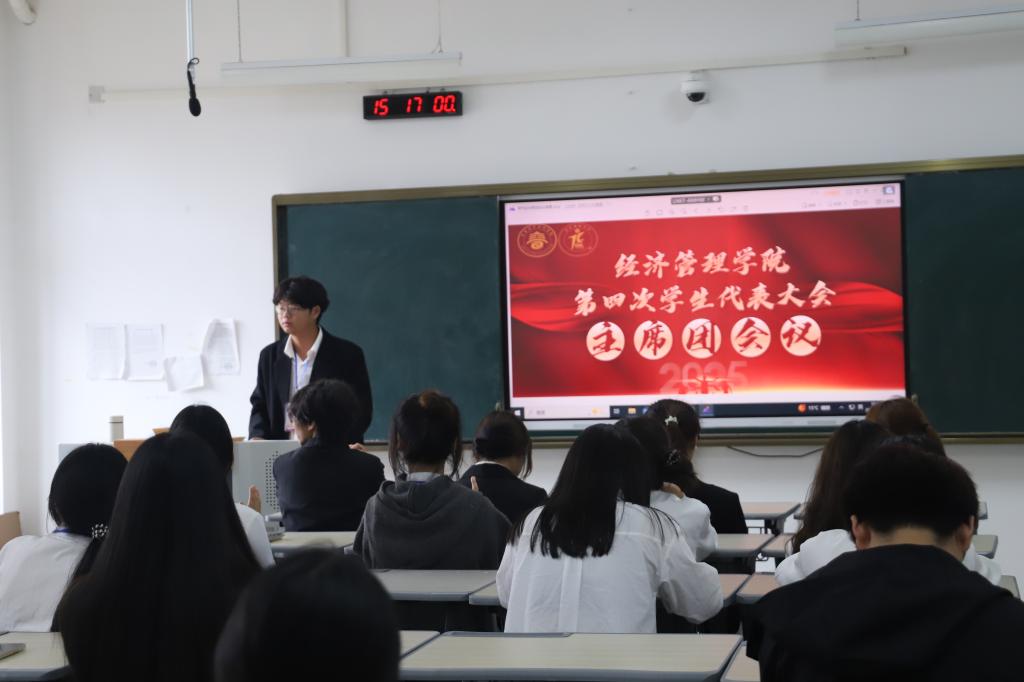 本站讯(经济管理学院 曹力勤 学生记者 周静蕊)10月29日下午,经济管理学院第四次学生代表大会在仁济楼小礼堂隆重举行。院党总支书记邓晶,院长邓如星,党总支副书记毕发钱,学工科科长熊园园,团总支负责人曹力勤,辅导员周钰朵及学生代表们参加了会议。校团委老师张为岷列席。