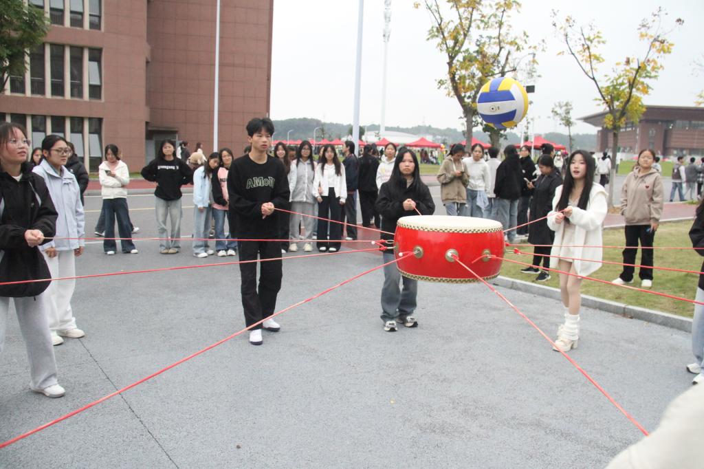 本次活动设置“不倒森林”“一圈到底”“珠行万里”“同心击鼓”等九个集体项目。在“珠行万里” 比赛中,队员们通过U型槽依次传递小球,动作衔接无缝,尽显团队协作的流畅与默契;“同心击鼓”项目中,全体队员紧握绳索、凝心聚力,整齐划一地操控鼓面颠球计数;个人跳绳项目中,参赛选手身手矫健、绳影翻飞,尽显利落身姿;篮球定点投篮现场,队员们凝神静气,精准投掷,将现场气氛推向高潮。各场地加油声、欢呼声此起彼伏,展现出青年学子团结进取、朝气蓬勃的精神风貌。