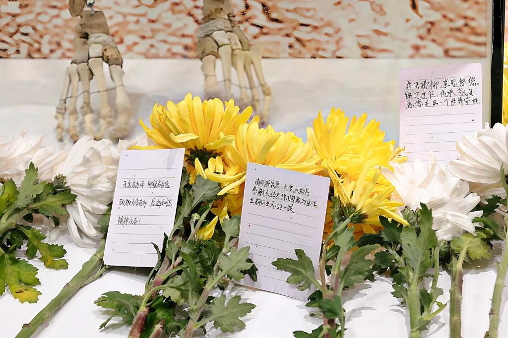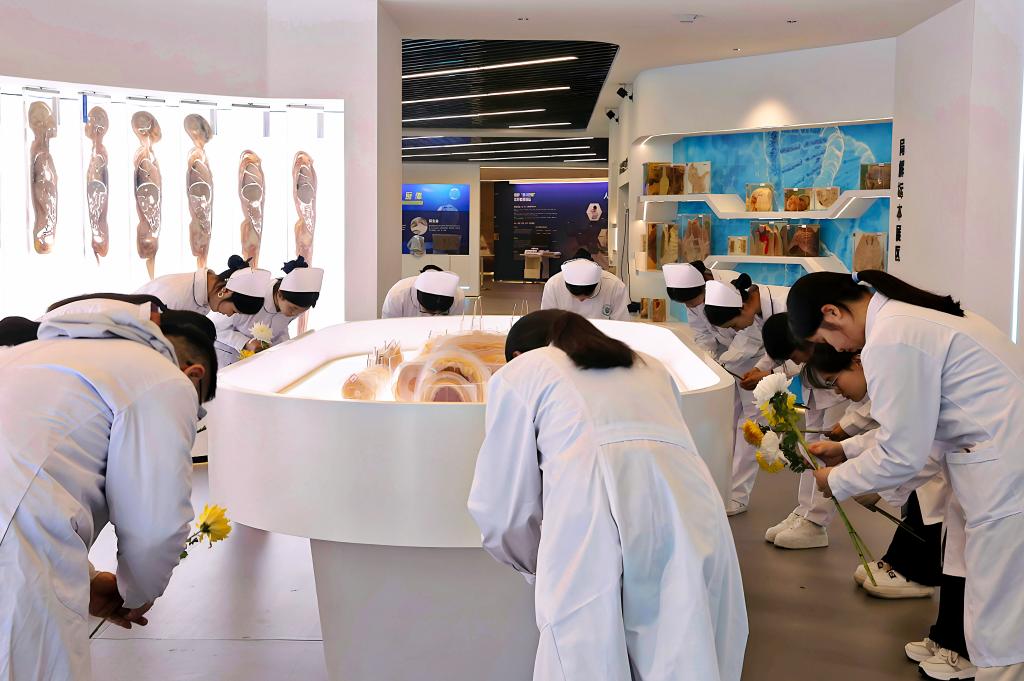 仪式结束后,师生分组进入生命与健康科学馆感恩区、断层区、消化区与运动区,依次向大体老师默哀鞠躬,并献上鲜花与感恩卡。敬献仪式后,全体人员参观生命与健康科学馆,各民族师生相互交流感悟,现场洋溢着同心同行的温暖氛围。