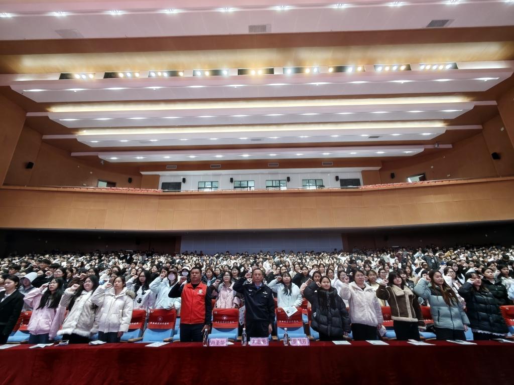 讲座尾声,在苏飞扬的带领下,全体参会人员高举右拳,庄重进行禁毒宣誓,铮铮誓言响彻整个大会堂,彰显了青年学生坚决抵制毒品、守护青春健康的坚定决心。