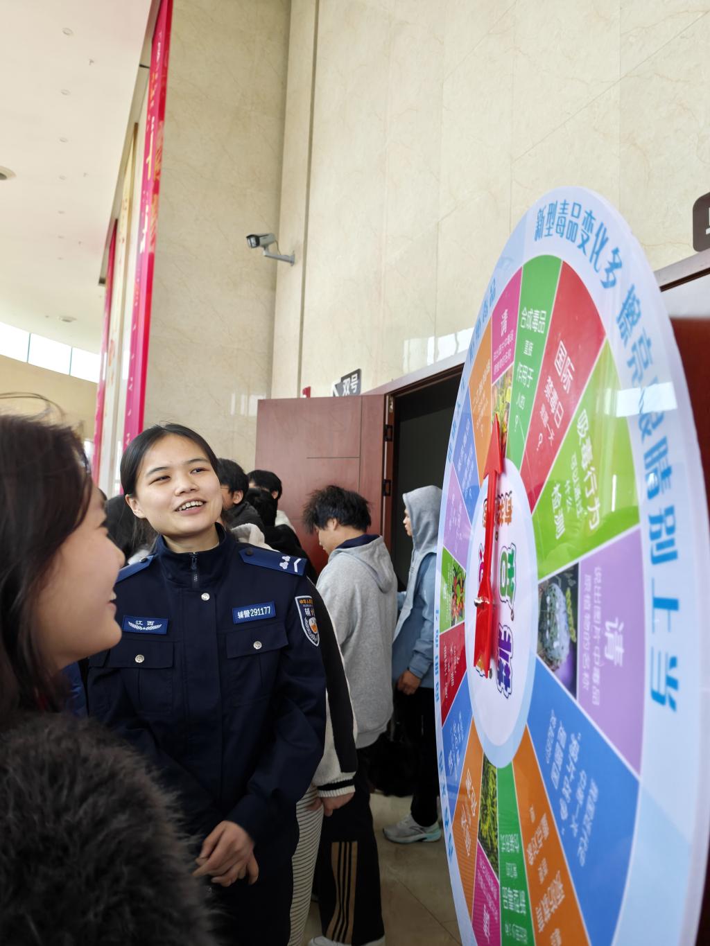 室内讲座结束后,礼堂外的户外打卡互动区同样热闹。活动设置了三大体验区域:禁毒墙打卡区内,同学们纷纷驻足拍照,留下自己参与禁毒宣传的专属印记;禁毒问答转盘前,袁州分局禁毒大队民警耐心提问并细致讲解禁毒知识,答对问题的同学能获得禁毒宣传小礼品;毒品样品展示区内,禁毒协会成员结合展板和仿真毒品模型,为同学们逐一讲解各类毒品的外观特征、伪装形式及危害后果,帮助大家提升识别毒品、防范诱惑的能力。