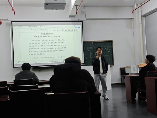 随后,欧阳健林老师部署本学期工作重点,一是要保持心理委员定期宿舍走访,掌握班级同学心理动态,向班主任反馈异常情况这一常态化工作,二是重点解读本学期 “心理健康月” 系列活动方案,围绕活动主题、形式设计及分工安排进行详细说明,鼓励各心理委员主动牵头、积极组织,在参与活动策划与落地的过程中收获成长、传递温暖。