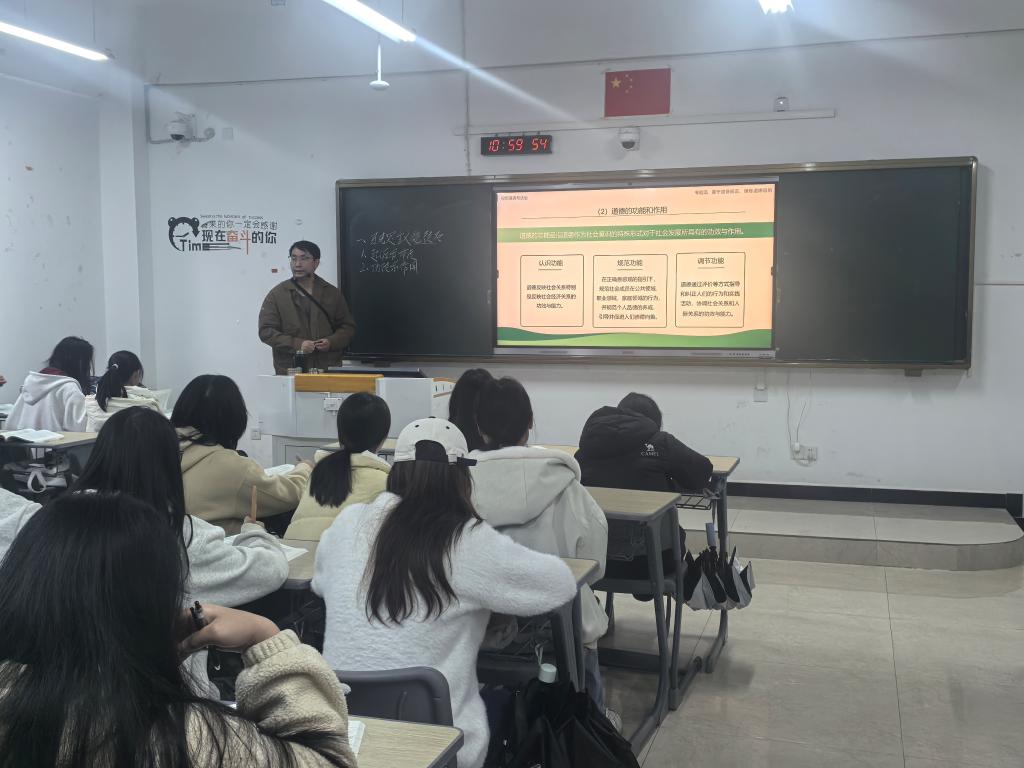 课堂上,吴旋老师以“社会主义道德的核心与原则”为主题,重点讲授马克思主义道德观、以为人民服务为核心、以集体主义为原则等内容,结合现实生活,选取丰富案例,用“小故事”讲好“大道理”,积极与学生互动,课堂氛围良好。