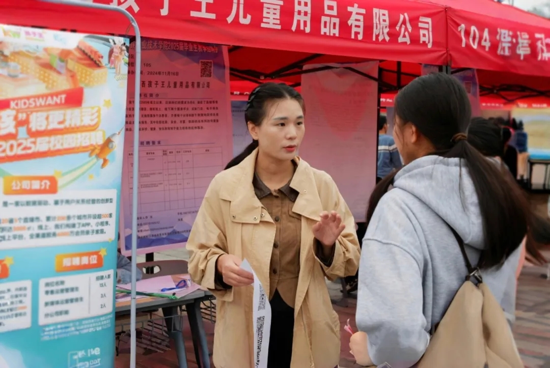 本站讯(团委 曹招 刘嘉妮 王玮 学生记者 邹欣宇 鲁思甜)为贯彻落实党中央、国务院促进高质量充分就业决策部署,搭建用人单位与毕业生之间双向选择平台,11月16日上午,我校在开物广场开展宜春职业技术学院2025届毕业生秋季招聘会。本次招聘会共有178个企业,他们从全国各地来到宜职广纳贤才,与即将毕业的宜职学生们现场洽谈。众多同学积极参与,场面热闹非凡。招聘会现场提供多种就业岗位,其中更有全国知名企业赵一鸣零食、海底捞等等。如果你经常和你的朋友说,“我要吃零食”“我想吃海底捞”,不妨一试呢!