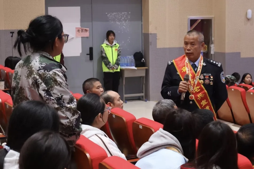 本站讯(团委 张为岷 刘嘉妮 王玮 学生记者 曾雅萱 汤包根)为弘扬爱国精神,赓续红色基因,激励青年一代铭记历史,勇担强国复兴重任,10月21日晚,我校于博达楼演艺厅开展“功臣老兵进校园,红色传承强国梦”未来工匠说主题讲座,本次讲座特邀冯辉明、邹平生、熊厚礼、陈文昌、黎竹芳五位老兵莅临现场,马克思主义学院教师以及来自各学院、校希望之家爱心社和星光社会实践社的400余名学生代表参加,由校党委委员、副校长张彩凤主持,冯辉明担任主讲人。庄严的国歌中,讲座拉开帷幕。五位身着戎装的老兵如青松般挺立,胸前佩戴的勋章在灯光下闪烁着金色的光芒,每一道光芒,都在讲述一段血与火的故事。身着军训服的学生代表上台为老兵献花,台下响起经久不息的掌声。紧接着,冯辉明以他的参战经历和探案实践为引子,展开主题宣讲。这位年过花甲的老兵声音洪亮,目光如炬;在场学生踊跃发言,积极互动,精神的旗帜在这里交接。