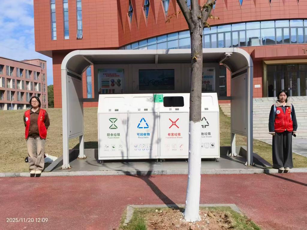 21日,志愿者来到学校各处智能垃圾箱旁,向来往的同学介绍垃圾分类知识,引导同学们树立垃圾分类的环保意识,倡导同学们积极参与到垃圾分类的行动中来,助力绿色校园建设。