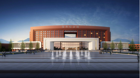 图书综合楼为宜春职业技术学院新校区的标志性建筑,总层数为12层,建筑高度51.85m,建筑面积44961㎡。主要功能有图书馆、阅览室、校史展览馆、多功能报告厅、学校行政办公厅、网络中心等。该建筑采用半弧形的建筑形态,结合楼前曲线流水布置,通过综合楼窗口,达到显山露水姿态,蕴藏丰厚的人文内涵与哲理。