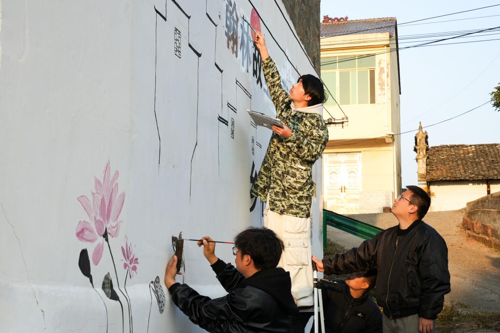 活动启动后,学院选派师生党员、专业教师及学生骨干组成创作团队,深入谢家村田间地头、村舍巷道开展实地调研。团队与村民深入交流,挖掘地方文化特色,结合村庄自然环境与人文历史,反复研讨、优化设计方案,力求使艺术创作既体现时代精神,又扎根乡土文化。12月28日,双方举行党建共建意向书签约仪式,正式确立结对共建关系。协议明确将以“组织共建、资源共享、发展共促”为目标,建立常态化合作机制,推动组织生活联动、党员教育互动、志愿服务协同,构建校地党建融合发展新格局。次日,创作团队在村内多处墙体开展艺术创作。师生以画笔为媒,将党建主题、农耕文化、乡风民俗等元素融入现代设计语言,创作出一系列主题鲜明、色彩明快、富有感染力的墙绘作品。原本斑驳老旧的墙面焕然一新,变为传播文明乡风、展现乡村活力的“文化窗口”,吸引了众多村民驻足欣赏。