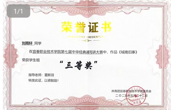 本站讯(艺术与设计学院 赖培鑫)2025年5月22日,宜春职业技术学院第七届中华经典诵写讲大赛圆满落幕。我院音乐教育24301班刘雨轩同学在雷斯羽老师的精心指导下,凭借诵读作品《城南旧事》荣获学生组三等奖。