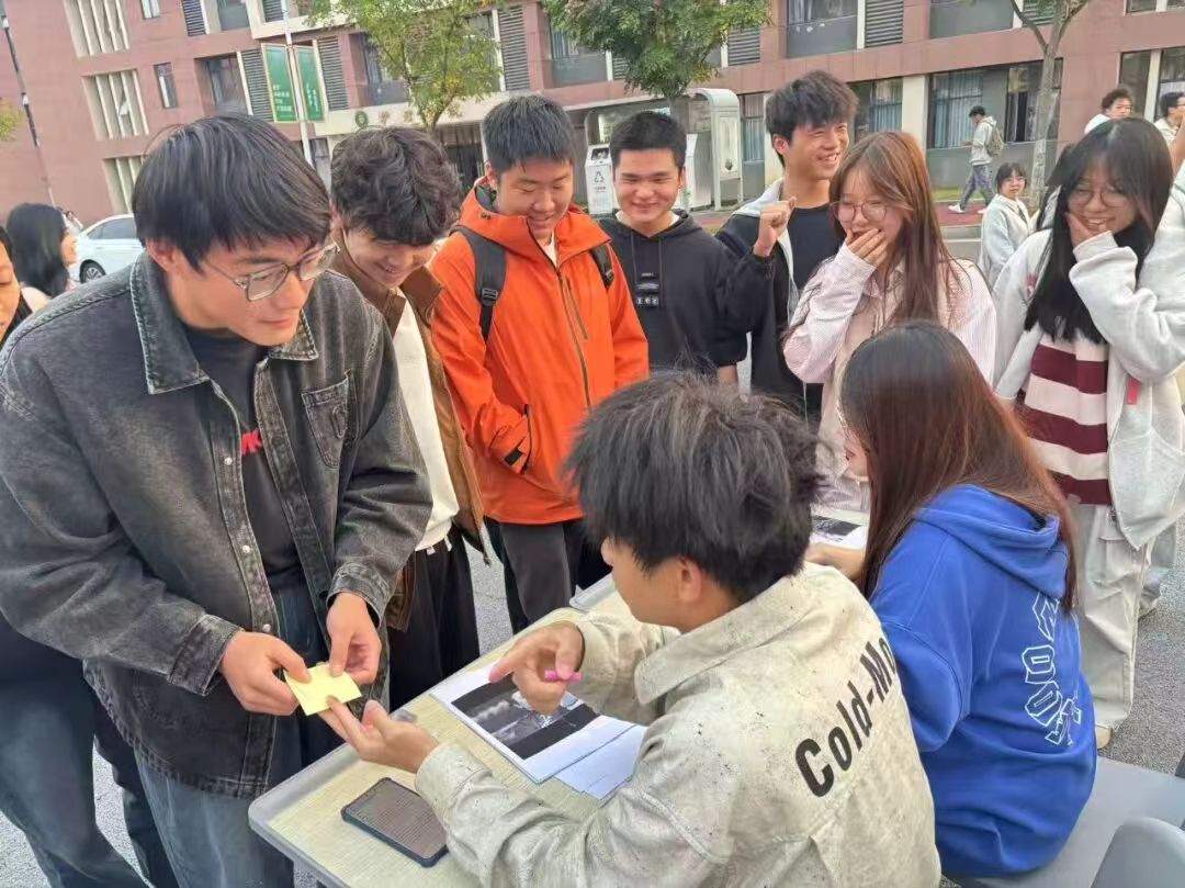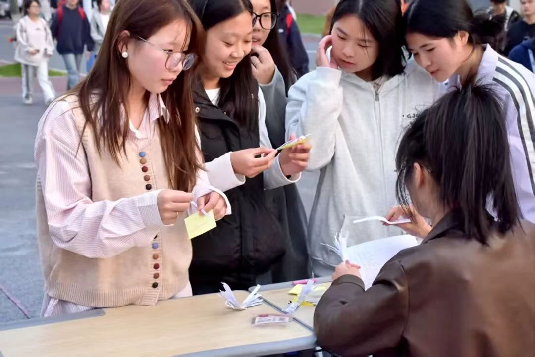 活动现场人头攒动,气氛热烈。精心设计的三大挑战区——“脑洞猜谜屋”、“趣味方言挑战”和“气球平衡挑战”前都排起了长队。在“脑洞猜谜屋”,同学们绞尽脑汁,破解一个个谐音梗与脑筋急转弯,不时发出恍然大悟的笑声;“趣味方言挑战”则让大家在“猜含义”的过程中,领略了各地语言的独特魅力,尤其是当听到熟悉的家乡话时,现场更是一片欢呼与共鸣;而在“气球平衡挑战”区,参与者们小心翼翼地夹着气球,在赛道上“蹒跚前行”,滑稽又专注的姿态引得观众阵阵加油与喝彩。