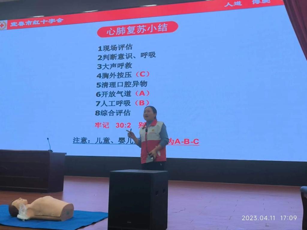 为深入贯彻习近平总书记关于健康中国建设的重要论述,进一步提高师生安全防范意识和自救互救能力,建设平安校园,落实我校“三比三争”工作要求,4月11日下午,医学院(附属医院)在仁济楼小礼堂举办“救在身边·校园守护”暨2023年度应急救护培训启动仪式。校党委委员、副校长刘叶建,袁州区红十字常务副会长丁雯凤,宜春市博爱救护中心主任王艳等出席此次活动,并分别进行讲话。各学院2022级400名学生干部代表参会。