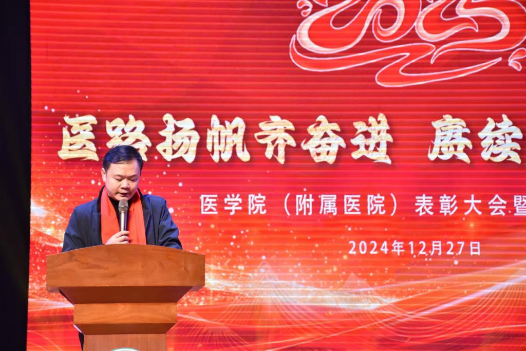 医学院院长黄远珺作新年致辞。他围绕人才培养、技能赛事等回顾总结2024年学院所取得的成绩,对新的一年给予美好的寄语,并对优秀学生和优秀老师代表进行表彰,鼓舞全院教职员工及学子追求卓越,续写辉煌,用扎实行动为学院的发展增光添彩。